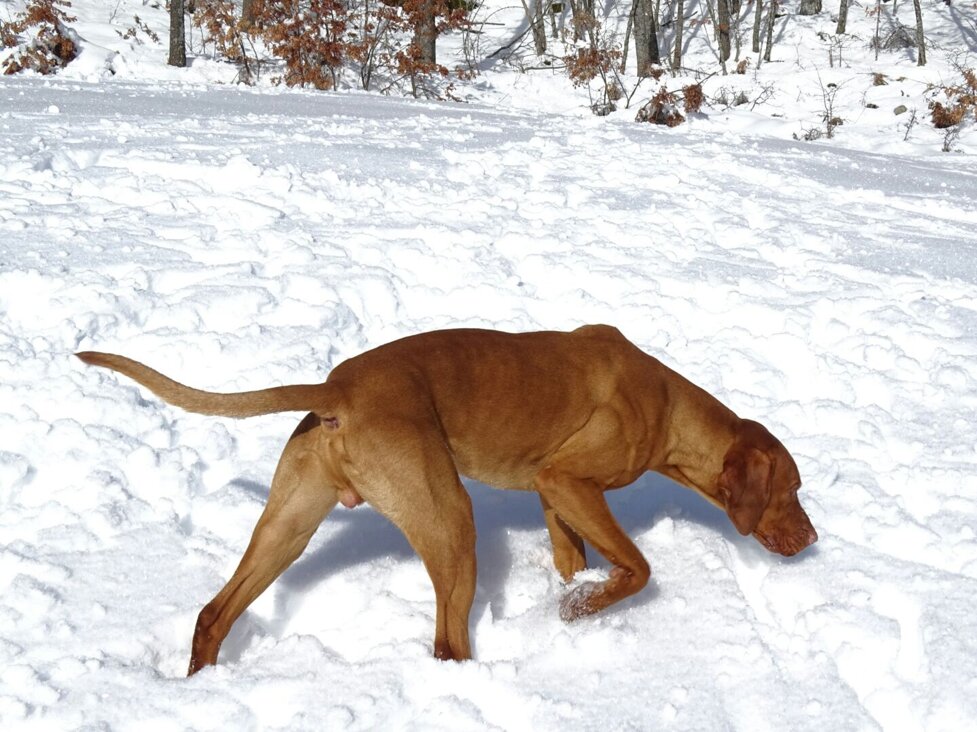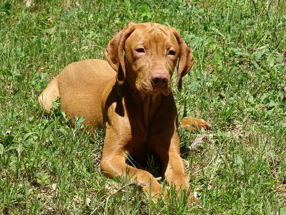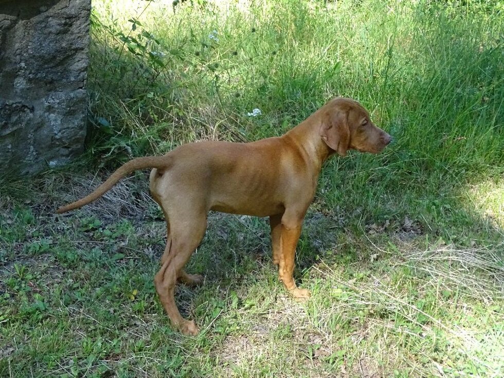 Analogamente ad Alexej anche Gurkha a quattro mesi evidenzia una bellissima testa, il colore del mantello “semmel brot”, nella variante chiara che tanto amano gli ungheresi. Già a quattro mesi si notano gli appiombi perfetti, canna nasale dritta, con tartufo del colore di una tonalità più scura del mantello, come richiesto dallo standard, muso tronco (angolo pefettamente a 90° fra muso e canna nasale), schiena dritta, coda dritta, occhio color ambra: che dire, sembra costruito in laboratorio!!!